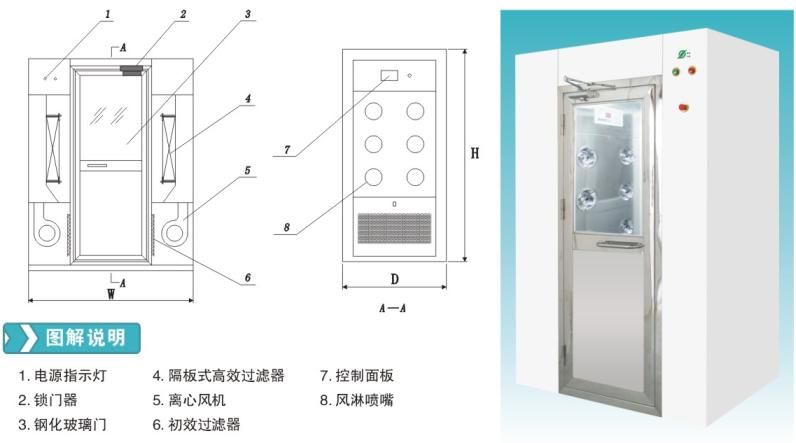 1. 風(fēng)淋室由箱體、門、高效過濾器、初效空氣過濾器,送風(fēng)機、配電箱、噴嘴等幾大部件組成。